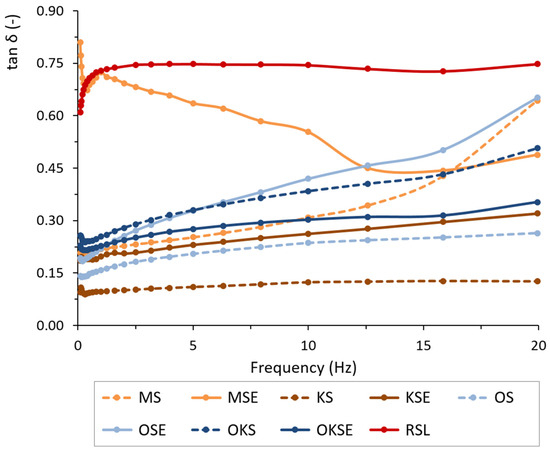 To determine the viscoelastic properties of studied creams and to evaluate the storage modulus (G′), loss modulus (G″), and phase angle (tan δ), the frequency sweep was performed. The mechanical spectra (viscoelastic moduli as a function of frequency) obtained at the 25 °C and 0.1% strains are plotted in Figure 1. The predominance of the storage modulus over the loss modulus in the whole range of frequencies studied indicated that all creams exhibited a gel-like behaviour, probably related to an internal three-dimensional network structure [37]. The results showed two groups of plant-based creams with different viscoelastic behaviour, as can be seen in Figure 1. Oat–coconut creams (OKS, OKSE) exhibited viscoelastic properties different t other samples. For these cream types, the viscoelasticity was enhanced by the emulsifier application, as shown by lower values of phase angle (tan δ) determined for OKSE in the applied frequency range (Figure 2). We hypothesise that the mix composition of oatmeal and coconut particles (1:1 weight percentage ratio), with a higher volume percentage of coconut particles, caused a decrease in tan δ, i.e., the emulsifier slightly increased the viscoelasticity of OKSE.