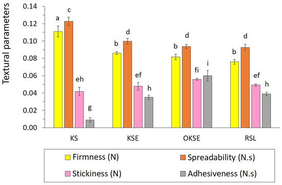 Samples with the appropriate consistency of KS, KSE, OKSE, and RSL were applicable for texture analysis, as can be seen in Figure 3. Studied samples were comparable in textural attributes observed, i.e., firmness, spreadability, stickiness, and adhesiveness. As is evident, the addition of emulsifier had no statistically significant effect on firmness, spreadability, or stickiness; adhesiveness was slightly higher for OKSE. KS showed significantly higher values of firmness and spreadability and reduced adhesiveness, which could be related to higher elasticity of this sample, as discussed in Section 3.1. The addition of emulsifier (KSE) resulted in an increase in adhesiveness and reduction in firmness and spreadability. It might be explained by interactions between the emulsifier with proteins/saccharides by hydrophobic interactions, leading to the unfolding of proteins and the increasing affinity of the sample to the surface [42]. The results are in accordance with the fact that plant-based cream spreadability is inversely proportional to viscosity [43,44], indicated by the change in viscous/elastic component in the samples. Plant-based cream properties were affected by the ingredients’ composition, particularly oil/fat content [45], and the application of emulsifiers with a practical intention to optimise the texture profile of prepared products. Textural parameters of samples in the present study were comparable with the gel firmness determined by Gupta et al. [46] for plant-based yogurts.