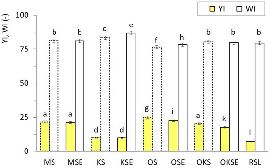 Yellowness index YI (yellow bars) and whiteness index WI (white bars) of plant-based creams without emulsifier (dotted lines) and with emulsifier (solid lines) measured in reflectance mode. Bar charts are presented as arithmetic means of three measurements with the error bars representing the standard deviations. Different superscript letters above the bars indicate significantly different values (Tukey’s test, p ˂ 0.05).
