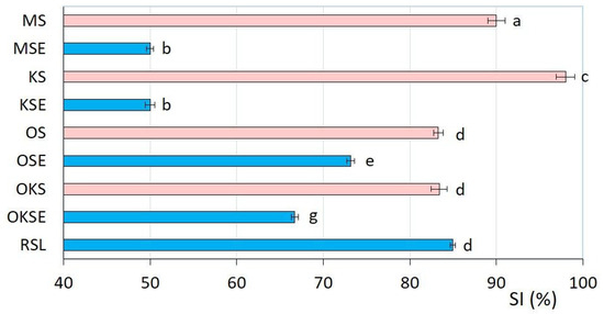 As is evident from Figure 5, relatively high emulsion stability (above 80%) was observed for MS, KS, OS, OKS, and RSL samples. The highest stability index (SI) determined for KS may be associated with the presence of dispersed coconut proteins and phospholipids in the cream structure. The main role might be attributed to cocosin, the most abundant storage protein of coconut, which is able to stabilise o/w emulsions by surface-active molecules; these molecules can absorb on the surface of oil droplets (at the oil–water interface) and prevent the aggregation of the oil phase via repulsive forces [41,48,49]. This emphasised the effect of proteins in stabilizing plant-based creams by creating a protective layer around the oil droplets, i.e., the effect of protein–lipid interactions [50]. However, the application of emulsifier can alter the dynamic of these interactions and thus the creams’ colloidal stability.
