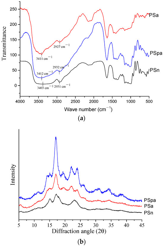 Our results showed that the crystallinity of PSpa reached 26.6%, which was higher than the crystallinity of PSa (20.5%) and PSn (13.3%) (Table 1). The increase in linear chains was probably the main reason for the PSpa having a relatively high crystallinity, which was consistent with its thermal properties.