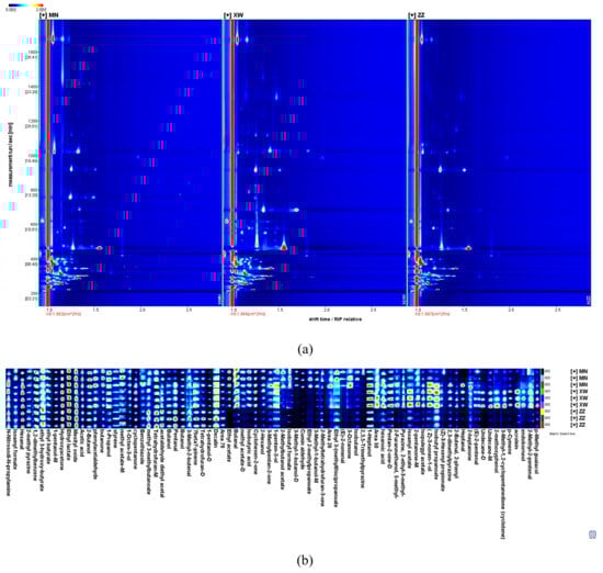 Fingerprints of three non-smoked bacons, obtained with GC–IMS. (a) Topographic plots; (b) dynamic fingerprints of three non-smoked bacon. While each column represents the same volatile compounds in several samples, each row reflects the signal peak of a single sample. Colors serve as a visual representation of a volatile compound’s content; a brighter color represents greater content.
