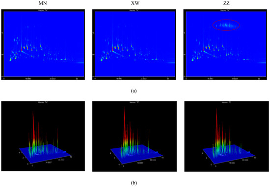 A 2D (a) and 3D (b) chromatogram of volatile compounds in non-smoked bacon via GC × GC–TOFMS.
