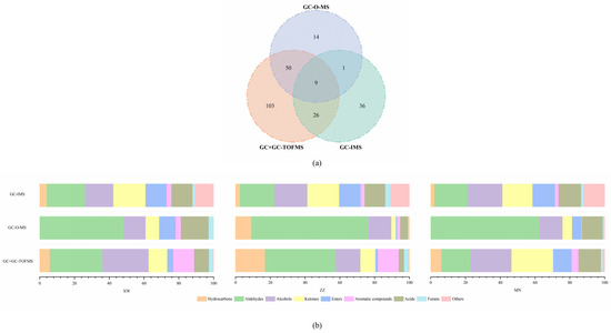 Comparison of Venn diagrams for extraction of volatile compounds by GC–O–MS, GC × GC–TOFMS, and GC–IMS (a); comparison of quantities of various volatile compounds extracted from non-smoked bacon by GC–O–MS, GC × GC–TOFMS, and GC–IMS (b).