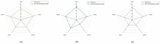 Aroma profiles of non-smoked bacon compared with aroma recombination model. (a) Recombination model of XW bacon; (b) Recombination model of ZZ bacon; (c) Recombination model of MN bacon.
