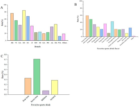 The online survey results for sports drinks ((A) consumer’s favorite brands of sports drink; (B) consumer’s favorite characteristics of sports drinks; (C) consumer’s favorite taste of sports drink).