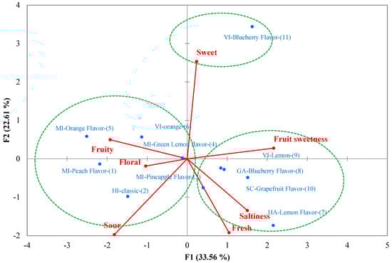 PCA was conducted based on the duration of different sensory attributes (Figure 2). The 11 samples could be divided into three categories: (1) MI-orange, MI-lime, MI-peach, VI-orange, and HI-classic flavors were located at the negative axis of the first principal components with strong fruity, floral, and sour perception; (2) MI-pineapple, VI-lemon, SC-grapefruit, and HA-lemon flavors were located at the positive axis of the first principal component and the negative axis of the second principal component with strong fruit sweetness, saltiness, and fresh perception; (3) VI-blueberry flavor was located at the positive axis of the first and second principle components with a strong sweet attribute. In addition, the ranking of panelist consumer preferences was consistent with the cluster analysis results; the first class had the highest ranking of panelist preference from 1 to 6, whereas the second category was ranked mainly from 7 to 9, and the final category was ranked last. The cluster and ranking test results confirmed that the higher preference sports drinks had more complex flavor change patterns during oral processing. The PCA analysis was consistent with the TDS analysis, where fruity, floral, and sour perceptions were the key characteristics of sports drinks that determined consumers’ preferences.