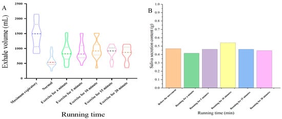 Oral parameter changes during running ((A) exhale volume of single exhalation through the nasal cavity; (B) saliva secretion with different running times).