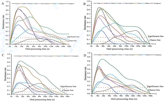 Dynamic flavor perception during drinking of MI-peach flavor with different running times ((A), running 0 min; (B), running 1 min; (C), running 5 min; (D), running 10 min).