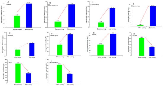 Recognition threshold change results of different flavor compounds before and after running ((A), linalool; (B), β-damascenone; (C), γ-decalactone; (D), ethyl cinnamate; (E), menthol; (F), fructose syrup; (G), sucrose; (H), citric acid; (I), NaCl; (J), tea polyphenols).