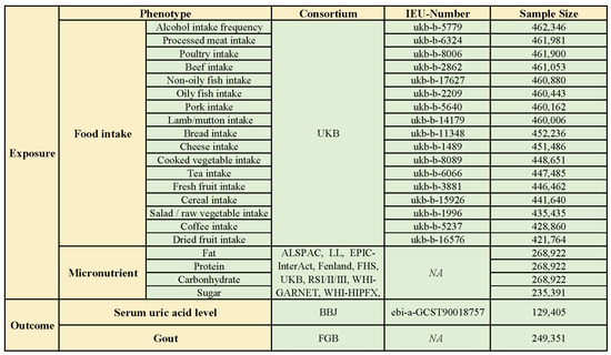 The data regarding food intake and serum uric acid level related phenotypes were obtained from the IEU open GWAS project database (https://gwas.mrcieu.ac.uk/) (accessed on 15 January 2024). Information on SNPs related to macronutrients was obtained from the GAWS literature (doi:10.1038/s41380-020-0697-5.). Gout phenotypes were extracted from the FinnGen database (https://www.finngen.fi/fi) (accessed on 15 January 2024).