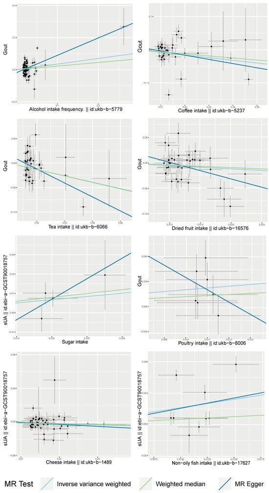 Scatter plots of MR analysis of dietary factors significantly associated with serum uric acid or gout (based on IVW, MR Egger, and Weighted Median) (sUA, serum uric acid).