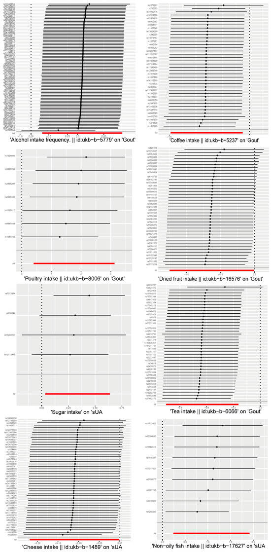 Leave-one-out sensitivity analysis of dietary factors significantly associated with serum uric acid or gout. (Each line indicates the estimated effect value and its confidence interval after getting rid of this SNP. The "ALL" in the bottom row indicates the combined estimated effect value and its confidence interval for all SNPs.)