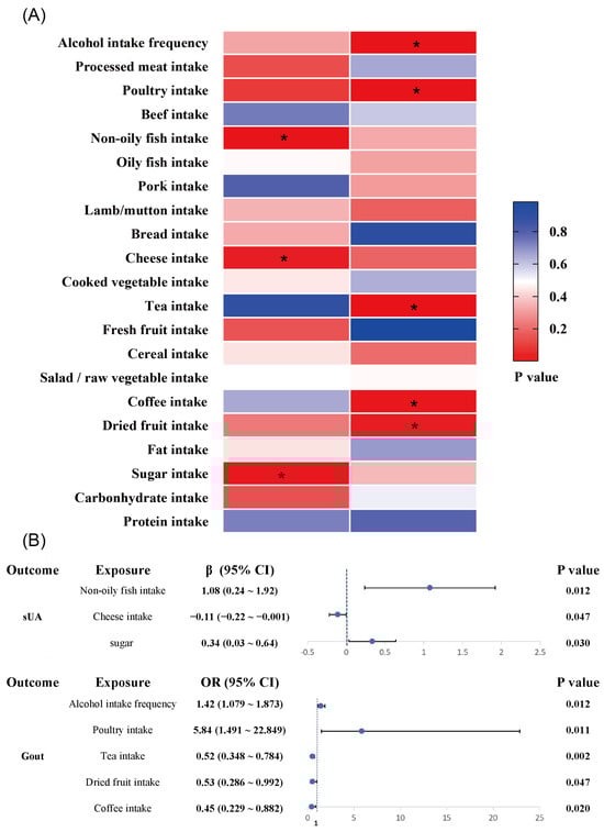 Risk/protective factor analysis of dietary intake based on IVW method: (A) heat map of the correlation between dietary factors and serum uric acid/gout (*, p < 0.05); (B) MR analysis of risk/protective factors associated with serum uric acid and gout. (sUA, serum uric acid; CI, confidence interval).