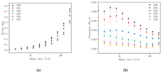 Steady-state rheological curves of lily juice at different ultrasonic power levels. Curve of shear stress with shear rate (a) and curve of apparent viscosity with shear rate (b). Three independent measurements were made for each sample, with the results expressed as the mean and the error bar as the standard deviation. US0: no ultrasonic treatment; US1: 152 W; US2: 304 W; US3: 456 W; US4: 608 W; US5: 760 W.