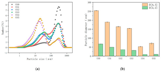 Particle size distribution curve (a) and average particle size (b) of lily juice under different ultrasonic power. D[4,3]: volume mean diameter; D[3,2]: area mean diameter D[3,2]. US0: no ultrasonic treatment; US1: 152 W; US2: 304 W; US3: 456 W; US4: 608 W; US5: 760 W.