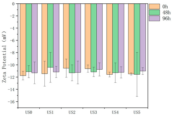 Zeta potential could be used to analyze the potential stability of the system. The charged state on the surface of particles in the lily juice system before and after ultrasonic treatment is shown in Figure 3. The zeta values of all samples were negative, indicating that there were more negatively charged particles than positively charged particles in the system. This was similar to the charged state of most fruit and vegetable juices. The negative electric state was related to the isoelectric point of protein in the lily juice [48]. The study found that when the environmental pH value of the system was higher than the isoelectric point of protein in the system, the solution showed a negative electric charge, and vice versa. The ultrasonic treatment did not change the pH value of the system, and the pH value was close to neutral at about 6.7, which was higher than the isoelectric point of protein (Table 2). When the particles were surrounded by a negatively charged pectin protective layer, it could also result in the overall surface being negatively charged [49].