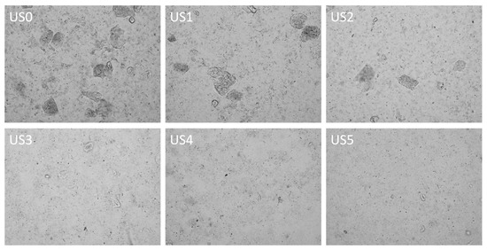 The microscopic characteristics of ultrasonic-treated lily juice were observed with an optical microscope. The control juice had many individual cells, cell clusters, and other microscopic particles (such as starch, protein, pectin, and fiber), indicating that lily juice was a complex system (Figure 4, US0). With the increase in ultrasonic power from 152 W to 304 W, the larger particles in the sample (cell clusters or other aggregated particles) gradually decreased, and the small particles (mainly separated starch, protein, cell fragments, etc.) increased significantly (Figure 4, US1–US2). This result was similar to that of guava juice [17] and pumpkin juice [16]. The erosion of particles was caused by the physical effects (shear forces and cavitation) generated during the ultrasonic process. It could be deduced that the intracellular substances were released into the lily juice when the cells were destroyed, which was one important reason for the change in the physical and chemical properties of the juice. When the ultrasonic power reached above 456 W, few large-sized particles existed, and the distribution of small particles became more uniform and denser. This is mainly because the breakdown of the material shifted from cell clusters and aggregated particles to smaller particles, such as separated starch, protein particles, and cell fragments, with the ultrasonic power increase. The microscopic characteristics were consistent with the particle size analysis (Figure 2). The change in the structure of small particles was also an important factor affecting the flow of liquid.