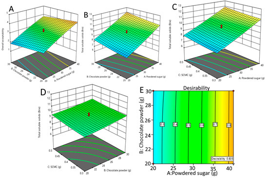 Effect of independent variables on dependent variables of GABA-rich functional beverage. Powdered sugar and chocolate powder on OAA (A), powdered sugar and chocolate powder on TSSs (B), powdered sugar and SCMC on TSSs (C), chocolate powder and SCMC on TSSs (D), and response surface plot showing desirability function (E). SCMC, sodium carboxymethyl cellulose; GABA, γ-aminobutyric acid; OAA, overall acceptability; TSSs, total soluble solids.