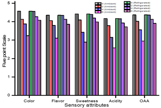 Differences in the sensory parameters of the GABA-rich beverage for both ambient and refrigerated storage conditions are presented in Figure 3. For the first two months of storage in a refrigerator, the beverage did not exhibit any sensory differences. However, after the second month, color and flavor differences were perceived. The color and flavor scores decreased with an increase in the storage period; however, a greater increase was detected when the samples were kept at room temperature, which indicated that a low storage temperature can retard the changes in flavor and color scores. Furthermore, the major characteristics of the product evaluated by the panelists during the sensory evaluation were sweetness and acidity, and the panelists detected changes in acidity during refrigerated storage. The study concluded that the beverage was suitable for consumption for up to 4 months at room temperature and 6 months when stored in the refrigerator, with slight acidification being detected by the sensory panels. These results were similar to those of Devi et al. [41] regarding whey-based fruit beverages stored under refrigeration.