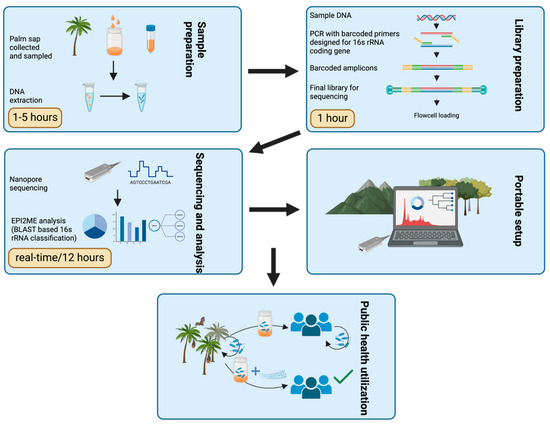 In our study, we performed a proof-of-concept bacterial metabarcoding analysis on raw date palm sap samples, focusing on the demonstration of the advantages of ONT fast bacterial metabarcoding (full-length 16s rRNA-based) and its mobility. This was carried out as an initial step towards establishing a reference for future food safety interventions with a mobile laboratory setup. Mobile lab solutions offer the significant advantage of enabling on-site, rapid diagnostic testing, thus reducing the response time in public health emergencies and outbreak investigations. By leveraging the portability of nanopore-based sequencing techniques, we were able to conduct this analysis in remote, low-resource locations. The primary aim of this study was to demonstrate that nanopore sequencing-based bacterial metabarcoding is an effective and rapid method for the identification of bacterial communities in food products, offering a significantly shorter diagnostic time-frame compared to conventional methods. With our study, we targeted a common but under-investigated food type, raw date palm sap, usually collected in remote places. The potential of mobile laboratory solutions for food safety purposes has been less explored previously.