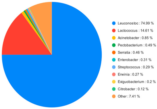 The carbohydrate concentration of palm sap usually reaches up to 95 g/100 g on a dry matter basis, containing mainly sucrose, glucose and fructose [7]. The research discovered two primary fermentation directions in the freshly collected raw date palm sap, dominated by either Leuconostoc species or Lactococcus species. With lower representation, only in samples 5 and 15, Lactococcus sp. was the dominant species, while, in the other 13 samples, it was Leuconostoc sp. (Figure 3).