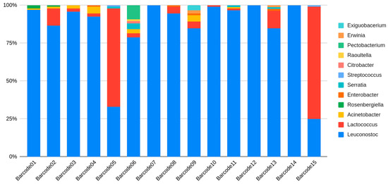 Overall, the species composition was similar throughout all 15 samples, as all were dominated by fermenting bacteria and other opportunistic bacterial taxa [16,17,18,19,20]. Since our study focused on the presentation of the nanopore NGS technique for application in food safety practices, our goal was solely to understand the bacterial composition of this food product; therefore, we did not implement any replicates or negative controls. Detailed sequencing results by barcode, with the most abundant genera, are summarized in Table S1. It is uncertain whether there is any difference between regions of collection or across different seasonal patterns, which may lead to more optimal circumstances for pathogenic bacteria. This also needs to be addressed in future studies.