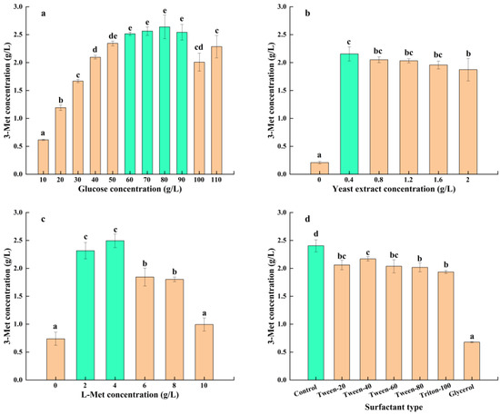 (a) Glucose concentration (10, 20, 30, 40, 50, 60, 70, 80, 90, 100 and 110 g/L), (b) yeast extract concentration (0, 0.4, 0.8, 1.2, 1.6 and 2 g/L), (c) L-Met concentration (0, 2, 4, 6, 8 and 10 g/L) and (d) surfactant types (Control, Tween-20, Tween-40, Tween-60, Tween-80, Triton-100 and Glycerol). The same letters in the column indicate that the data do not differ significantly at 5% probability using Tukey’s test. The green bar means the best conditions on 3-Met concentration.