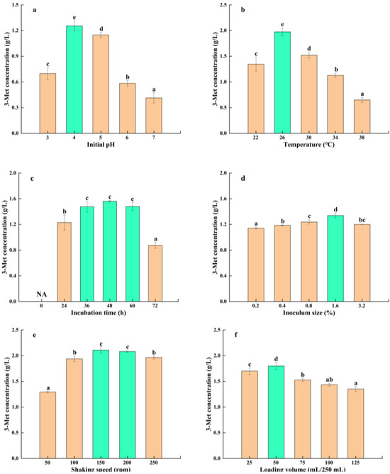 (a) initial pH (3, 4, 5, 6 and 7), (b) temperature (22, 26, 30, 34 and 38 °C), (c) incubation time (0, 24, 36, 48, 60 and 72 h), (d) inoculum size (0.2, 0.4, 0.8, 1.2 and 3.2%), (e) shaking speed (50, 100, 150, 200 and 250 rpm), (f) loading volume (25, 50, 75, 100 and 125 mL/250 mL). According to Tukey’s test, the identical letters in the column indicate there is no significant difference in the data with a 5% probability. The optimal 3-Met concentration levels are shown by the green bar. The letter NA stands for “no 3-Met detection”.