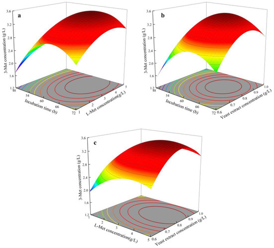 Through variance analysis and significance analysis (Table 7), it was found that the F-value of the fitted regression model was 8.46, with a corresponding p-value of 0.015 (p < 0.05), indicating the significance of the fitted model. The coefficient of determination R2 for the regression equation was 0.9384, indicating that the model had high accuracy and was used to predict the yield of 3-Met by S. cerevisiae Y03401. Additionally, the regression equation showed that loading volume, initial pH, and glucose concentration had a negative effect on the yield of 3-Met by S. cerevisiae Y03401, while the other six factors had a positive effect. The significance analysis indicated that yeast extract concentration, L-Met concentration, and incubation time had a significant impact on the yield of 3-Met, while the other factors had an insignificant impact. Therefore, further optimization was carried out for these three factors, while the levels of the other factors were set to the optimal levels determined by SFD designs, glucose concentration of 60 g/L, initial pH of 4.0, temperature of 26 °C, inoculum size of 1.6%, shaking speed of 150 rpm, and loading volume of 50 mL/250 mL.