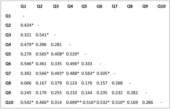 The association between Q1 and Q2 is less understandable; it is difficult to explain how a person’s food behavior may be consistent when they are curious about new types yet do not trust them. Except for the pair Q1 and Q9, the responses to food acceptance questions (Q1, Q4, Q6, Q9, and Q10) align with expectations. Respondents who are open to new variations may exhibit selective eating habits, which is natural. Conversely, questions probing the rejection of new foods (Q2, Q3, Q5, Q7, and Q8) are generally correlated, except for Q2 and Q3 with Q8, which were expected to correlate strongly.
