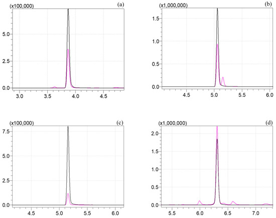 Chromatogram of clothianidin (a), diflubenzuron (b), chlorbenzuron (c), and pyridaben (d).
