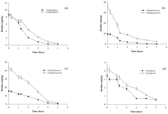 Dissipation trends of clothianidin (a), diflubenzuron (b), chlorbenzuron (c), and pyridaben (d) during field trials. (-L, low dosage; -H, high dosage).