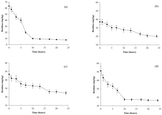 As shown in Figure 3, it can be seen that the residues of four pesticides degraded according to different trends during the drying processes. In the initial 10 h, clothianidin and pyridaben exhibited a relatively higher dissipation rate, followed by a slight decrease. In contrast, diflubenzuron and chlorbenzuron dissipated gradually during the whole drying process. Actually, during the drying processes, pesticides may have dissipated not only due to loss through water evaporation from fresh mushrooms but also hydrolysis, oxidation, photolysis, co-distillation, and metabolism. The rate at which pesticides are moved and dissipated is closely related to the physico-chemical parameters of the pesticide themselves and the surrounding environmental conditions [30]. Hence, one possible reason could be that clothianidin and pyridaben are sensitive to high temperatures. As a thermal processing treatment, drying could be more effective for the breakdown of these two pesticides. For the washing process, it has comparatively no effect on reducing the residues of diflubenzuron and chlorbenzuron because of their extremely low solubility. Furthermore, diflubenzuron and chlorbenzuron exhibited similar change trends (Figure 3a,d).