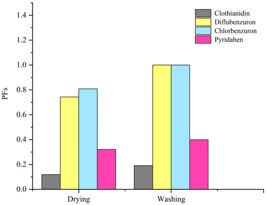 Routine combination and quantification of the processing factors into risk assessments would be helpful to provide a more realistic and clear picture of actual dietary exposure. In this study, PFs of four targeted pesticides are presented in Figure 4. For both drying and washing, it was indicated that the processing factors of diflubenzuron and chlorbenzuron were remarkably higher than those of clothianidin and pyridaben. To be precise, the PFs of the drying process for clothianidin, diflubenzuron, chlorbenzuron, and pyridaben are 0.119, 0.743, 0.808, and 0.321, respectively. For the washing process, the PFs are 0.191 for clothianidin, 1 for diflubenzuron, 1 for chlorbenzuron, and 0.399 for pyridaben.