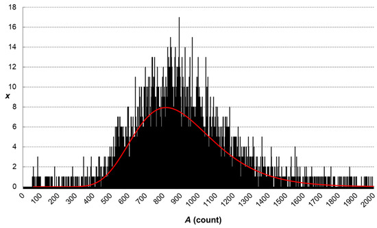 Using the result of classification of peaks according to the peak area, the distribution of particle sizes can be calculated. Firstly, the mass of the element in a single particle is derived from the peak area on the basis of measurement calibration, which utilises standard dispersion of nanoparticles of the known mean diameter (and therefore, the known mean mass), according to Equation (2):