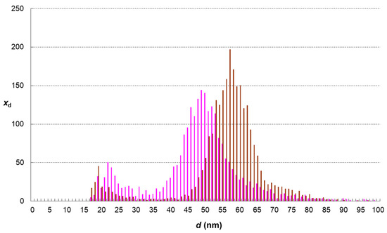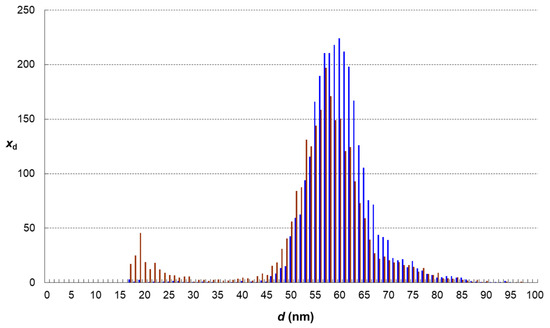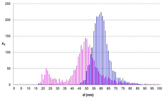 d. The step of diameter was 1 nm, so the range of diameter was 15 to 100 nm and 15 to 150 nm, respectively. The values of particle mass of specific diameter