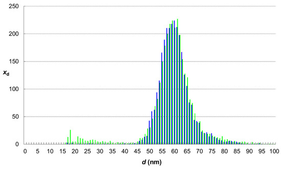 The diluted dispersions of these AgNPs standards were then analysed by sp-ICP-MS method to determine the size distribution of the nanoparticles. The expected values of particle number concentration of the standard dispersion calculated from the declared average diameters and from the declared silver mass concentration were 1.77 × 10