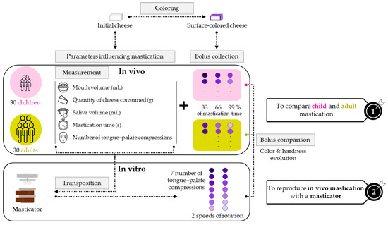 The scientific approach used in this study is illustrated in Figure 1. The processed cream cheese studied was consumed by children and adults; thus, two panels were recruited to represent both subject categories. Five parameters influencing mastication, usually measured in in vivo and in vitro studies [14,15,16,37], were calculated on these panels and transposed to the masticator (Oniris, 2013, device patent No. 1355509). The five in vitro ratios considered between the cheese sample, the mouth volume and the saliva volume (, , , , ) were in accordance with the in vivo ones. We hypothesize that child masticatory parameters are different from those of adults [27]. One of the challenges of this project included working with a soft, sticky and homogeneous cheese paste, which made the usage of well-known characterization methods such as sieving [24,27,37,39] irrelevant. On the contrary, image analysis, which does not require too much handling, seemed to be an efficient method to carry out characterization. The processed cream cheese analyzed, a homogeneous white paste, had to be colored first in order to be able to track its oral destructuring. An innovative way of coloring, only on the surface, was thus performed. With the inner part staying white, uncolored and colored layers were mixed during bolus formation and created a visual indicator of its destructuring degree. Image analysis could then be performed on this heterogeneously colored cheese. Additionally, a more common texture analysis was carried out to characterize hardness evolution through the mastication process. In vivo boli were collected at three different mastication stages (33, 66 and 99% of total mastication time). We hypothesize that the parameters influencing mastication of individuals have an impact on the cheese bolus characteristics [27,40]. In addition, we hypothesize that the mastication of a processed cream cheese by children and adults can be reproduced in vitro using a masticator. In vitro boli were collected at different numbers of tongue–palate compressions and speeds of rotation. The color and hardness of both in vivo and in vitro boli were compared through the different mastication stages to best match in vitro settings with in vivo child and adult chewing.