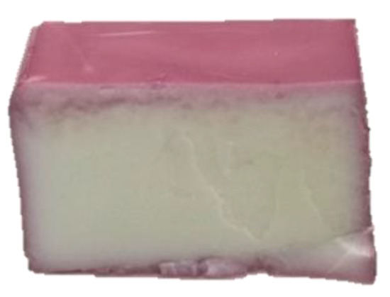 A purple-colored solution was prepared by dissolving 12.49 g of carrot and hibiscus mixture in 1 L of Evian water, while stirring for 10 min with the aid of a magnetic stirrer. Pieces of cheese (4.5 ± 0.2 g), placed on a fabric fixed in an embroidery frame, were then soaked in the purple solution for 7 min at room temperature. Only the surface of the cheeses was colored; the inner part stayed white (Figure 2). Cheeses were stored at 4 °C in inert transparent glass containers until analysis.
