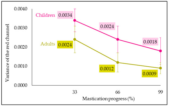 Child and adult red channel variance evolution in function of mastication progress (error bar: Pearson standard deviation).