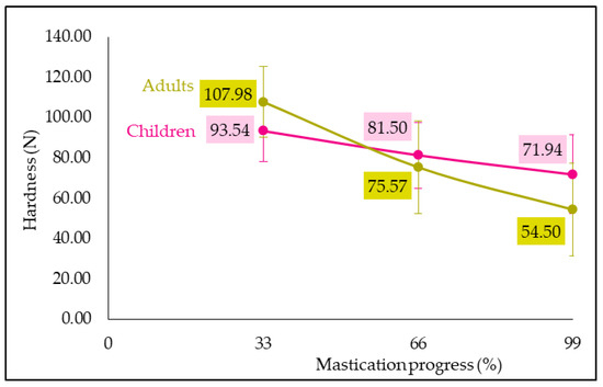 Child and adult hardness evolution in function of mastication progress (error bar: Pearson standard deviation).