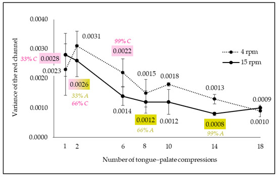 The different in vitro boli obtained by varying the number of tongue–palate compressions and the rotation speed were photographed. The variance of the red channel was analyzed on these images (Figure 6). The variance of the red channel decreased with increasing number of compressions, which means that the bolus homogeneity degree increased with mastication progress. It could be explained by higher saliva quantity and bolus destructuring with chewing, thus leading to a higher bolus homogeneity degree. Moreover, the red channel variance of the in vitro boli obtained at 4 rpm was higher than the one obtained at 15 rpm. In other words, the higher the rotation speed, the more homogeneous the bolus. It could be attributed to a more pronounced mixing with higher rotation speed, and thus a higher bolus homogeneity degree. The variance of the red channel of the in vitro boli was compared to that of in vivo boli. This comparison led to the selection of some in vitro parameters to reproduce both child and adult chewing (Table 5). A higher number of tongue–palate compressions was needed to mimic adult mastication than that of children. This result matched with the fact that adult mastication time was higher than that of children.