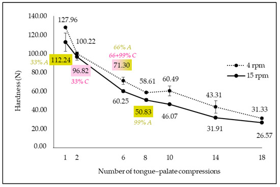 In vitro bolus hardness evolution in function of compression number and rotation speed (A/green text and filling: adults; C/pink text and filling: children; pink + green filling: applicable for children and adults; 33, 66 and 99%: mastication progress; error bar: Pearson standard deviation).