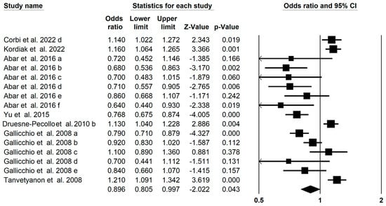 | Type of Cancer | Source of Carotenoids | No. of Meta-Analyses | OR (95% CI) | I2 (p Value) |