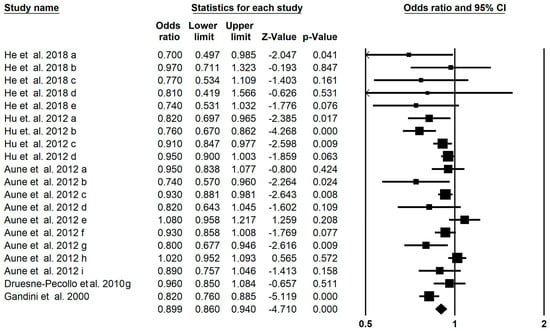 | β-carotene | 9 | 0.998 (0.892–1.117) | 0.866 (<0.001) | |