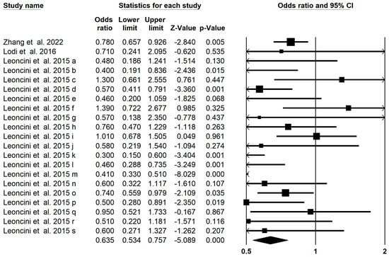 | Type of Cancer | Type of Carotenoids | No. of Meta-Analyses | OR (95% CI) | I2 (p Value) |
