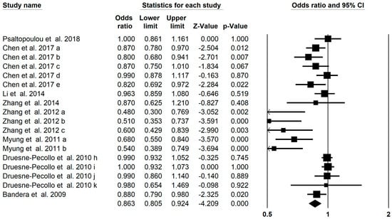 | gastric cancer | total carotenoids | 17 | 0.749 (0.668–0.841) | 0.806 (<0.001) |