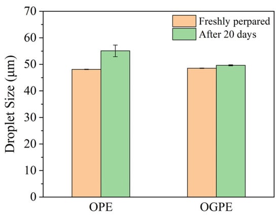 The change in the droplet size of the emulsion in the anionic surfactant with storage time reflected the condensation stability of the emulsion. Meanwhile, the presence of anionic surfactant may inhibit the flocculation of the emulsion droplets, thereby maintaining the separation of individual droplets in the emulsions [33]. The droplet sizes (D4,3) of OPE and OGPE, before and after 20 days of storage, are shown in Figure 1. The size of the droplets of OGPE showed few changes during the 20-day storage compared to the size of the OPE droplets, indicating that OGPE exhibited high coacervation stability. Since the coacervation stability of the emulsion droplets was closely related to the viscoelasticity of the interfacial film, OTF—GA complexes might form a more viscoelastic interfacial film, which was helpful for the inhibition of the condensation of emulsion droplets. In addition, sufficient OTF—GA complexes could be adsorbed on the oil–water interface, forming a denser protective barrier through effective accumulation, playing a steric hindrance role and reducing the condensation of the emulsion droplets [28].
