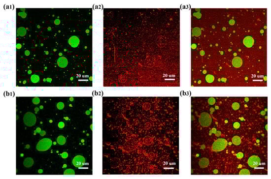 CLSM images of OPE (a1–a3) and OGPE (b1–b3). (a1,b1) The oil phase stained with Nile red is shown in green. (a2,b2) The OTF-GA complexes dyed with Nile blue A are shown in red. (a3,b3) The overlap channel.